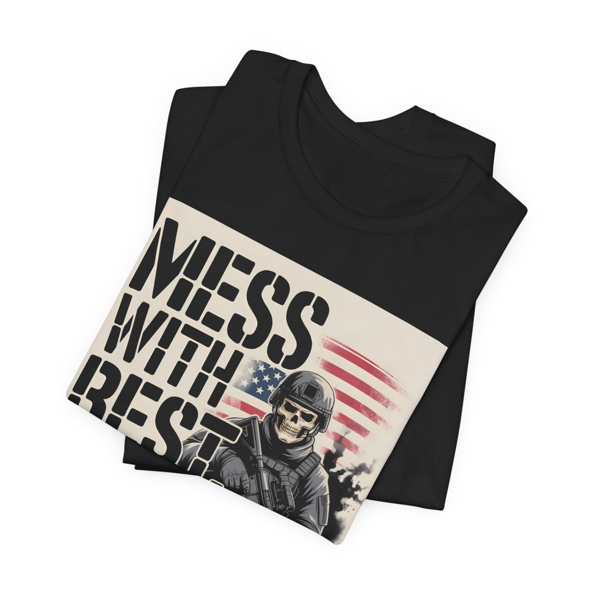 Send a message loud and clear with the “Mess With the Best, Die Like the Rest” T-shirt. Featuring a skull-faced soldier in combat gear with the American flag waving behind, this tee represents grit, pride, and the warrior spirit. Perfect for patriots, veterans, and those who refuse to back down.