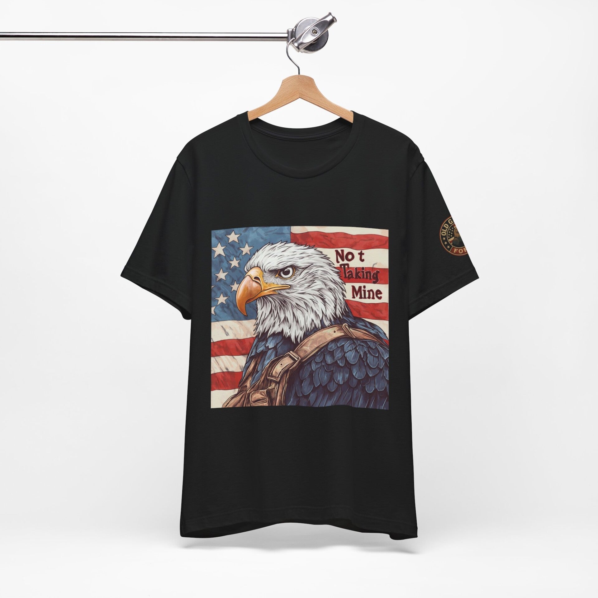 Defiance. Strength. Freedom. The Not Taking Mine T-Shirt features a fierce bald eagle in tactical gear against the American flag backdrop, paired with bold text: “Not Taking Mine.” A statement piece for patriots who refuse to back down.