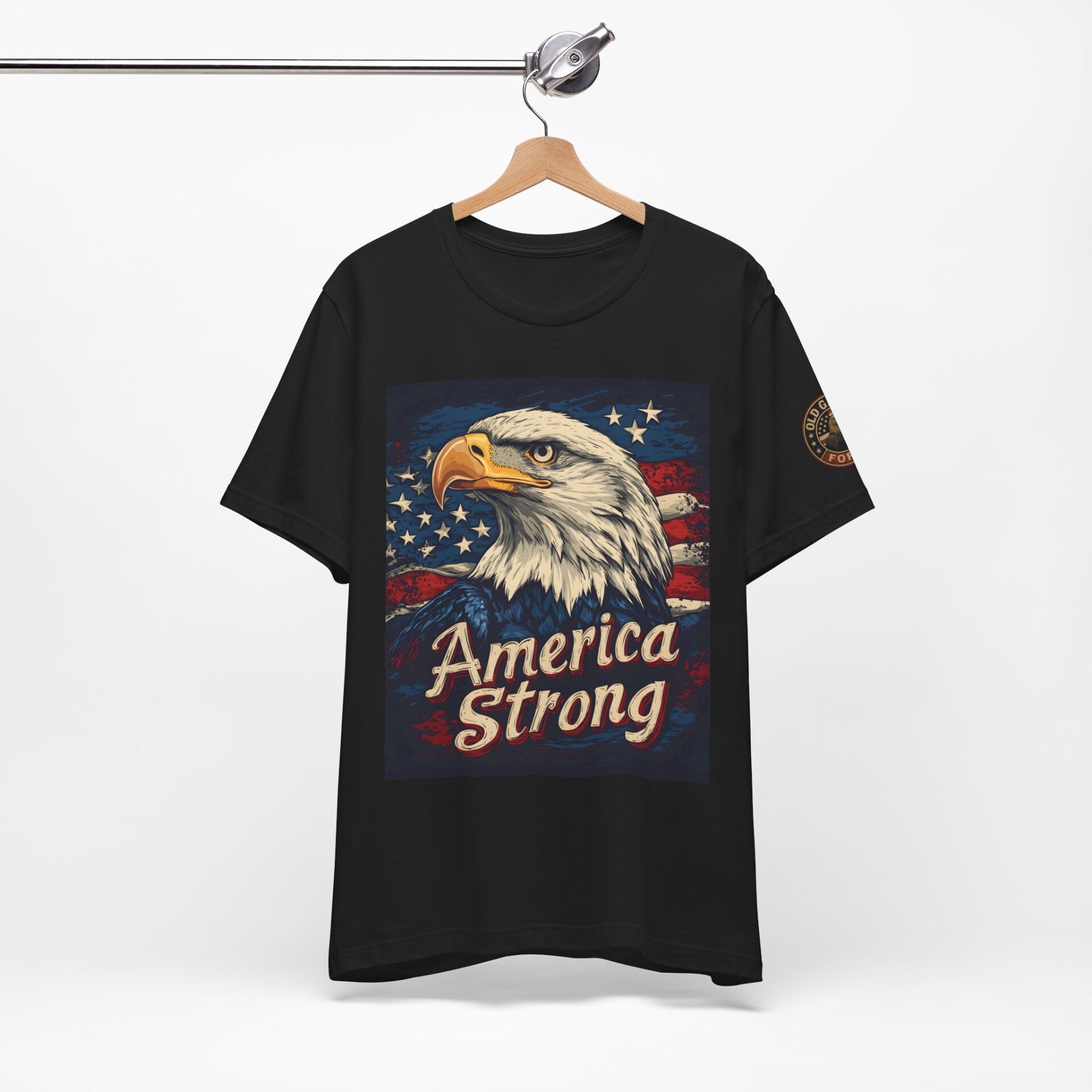 Strength. Freedom. Pride. The America Strong T-Shirt features a powerful bald eagle standing tall in front of the American flag, paired with bold vintage-style text: “America Strong.” A perfect statement for those who believe in the grit and spirit of the USA.